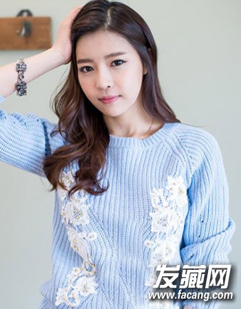 偏分的露额造型设计将女生精致的脸型完美的呈现出来,再搭配这种低调的深棕色染发颜色与简单的中长发烫发更添女生十足的温柔甜美风。