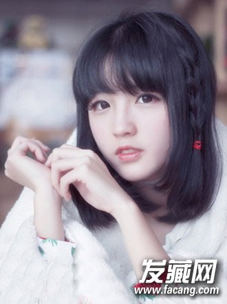 一头乌黑发亮的中短发发型,简单的打造成内扣披肩发型的造型,空气感十足的齐刘海,修颜减龄又显灵动,加入了编发的流行元素,更显清纯可人。