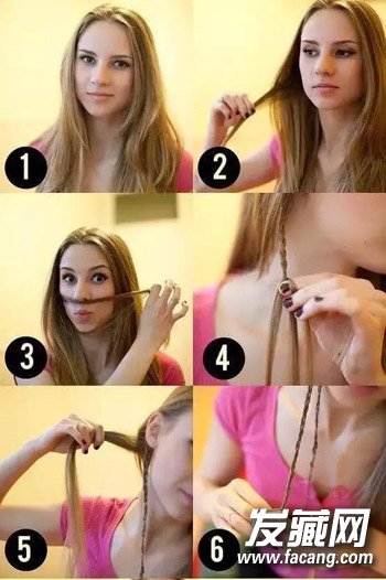 1 将头发自然垂下,从两侧耳朵后面编两条小辫子。