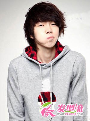 可爱风格的一款时尚发型设计,特别的斜刘海设计方式让头发呈现出一种圆弧形,大片的刘海遮住了额头,露出男生嬉皮可爱的面部表情,挑眼的棕黄色染发也为男孩增添分时尚感!搭配连帽卫衣,潮男一个哦!