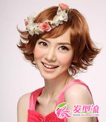 清爽的短发用定型产品抓出好看的造型,发尾全部微微向上翘起,增添了造型感,显得非常灵动俏皮,活力十足。淡淡的栗子色染发,突显时尚感,很是亮眼。斜刘海带出几分清新和妩媚。加个漂亮的花环发饰,可爱的吊带裙,就像落入凡间的花仙子,唯美梦幻。