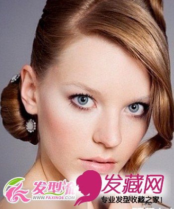用卷发棒将斜斜的长刘海做斜向上定型,就可以制造出优雅的螺旋卷长刘海了,并搭上斜在耳后的发髻。注意,整个发型最好保持柔顺感,没有一丝毛躁的发丝就最完美了。