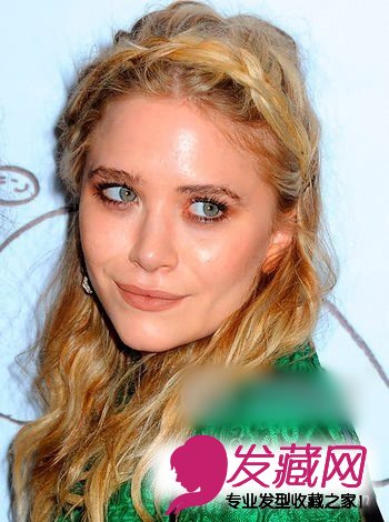 发型打造:先将刘海分成两份,以中分的形式向后梳起,露出光洁额头。取一侧长侧发,编成松松的麻花辫子,向上沿着额头绕过刘海根部作为类似发箍的装饰。