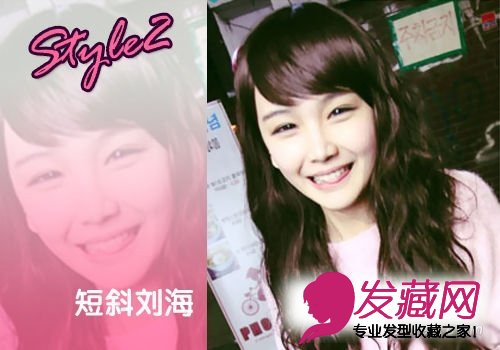 长脸的MM们可以留这款刘海喔!稍稍有些厚重的韩系风格短斜刘海,遮住了高额头,起到缩短脸型的作用,给人以可爱清纯的感觉。搭配上可爱的长卷发,厚重的发量营造出美丽的轮廓,很迷人哦!