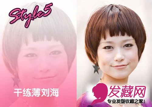 薄薄的极短刘海充满阳光般的活力,也给人一种干练的感觉。很适合年轻的OL哦!对于拥有较长脸部线条的女生来说,两侧的头发做出弧度可以打造出可爱圆脸效果。打造这款刘海的时候,要注意用风筒将刘海的分布吹均匀些,尽量往中间吹,这样可以避免外出时被风吹成中分的尴尬。