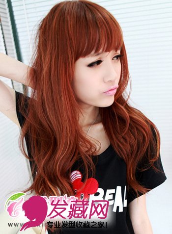 自然随性的微卷发发型,红棕色的染发颜色增加了卷发发型的时尚感,也衬托出女生白皙通透的肌肤,齐刘海的发型设计,凸显出一双犹如精灵般可爱迷人的双眼,尽显甜美可爱感。