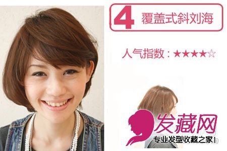 把大部分发量集中在刘海部位,有层次的裁剪和微微卷烫,让刘海很丰盈,又具有动感。经常埋怨自己发量太多的MM不妨尝试这种覆盖式刘海,减少发量的同时又可以修饰脸型,一举两得。简单的短发马上因为这个刘海变得时尚,如果短发搭整齐的侧刘海是不是有点傻乎乎呢。