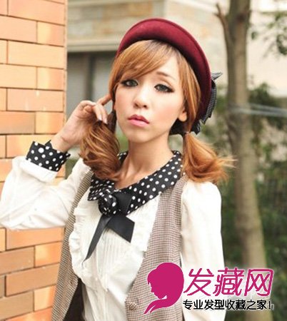 低扎的双马尾将女生的俏皮可爱展现的淋漓尽致,4/6的斜刘海发型设计凸显出了女生精致的五官,特别引人注目,搭配一顶贝雷帽,更是让人眼前一亮,流行抢眼。