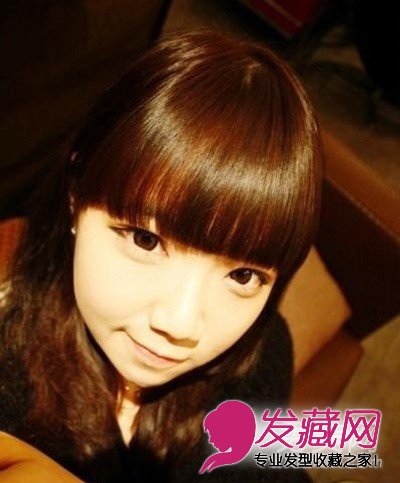 小编点评:很适合圆脸大眼的女生。齐刘海将一双大眼修饰的更灵动,棕红色的发色增添时尚感。将头发挽在耳后,配上会说话的大眼和圆圆的脸蛋,可爱的没话说。