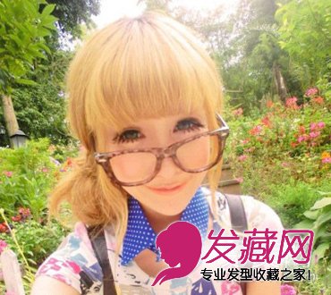 可爱非主流女孩低扎的侧发髻,慵懒随性,又不失俏皮可爱,整齐的刘海瘦脸掩龄,金色系的染发,呈现了个性潮流非主流女孩味道。豹纹的眼镜框更显古灵精怪呢!