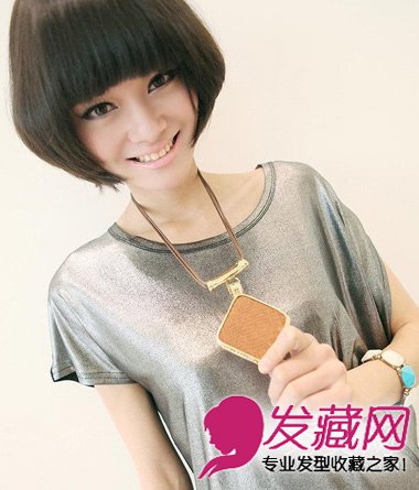齐刘海香菇头短发,厚厚的立体刘海,一刀切的裁剪,柔顺侧面发丝,贴面的内扣,简单而巧妙的搭配,打造可爱又俏皮的小脸减龄短发。