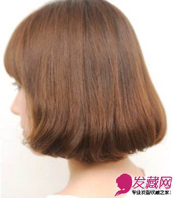 从侧面看这款短发发型,厚重感的发尾将头型修饰的更加饱满,内扣的卷发蓬松有致,浅棕色的染发更增质感。
