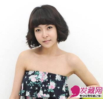 齐眉的卷曲刘海加上两侧蓬松的短卷发修饰出精致小巧的鹅蛋脸型,看起来非常甜美优雅,加上乌黑的发色,更显自然纯净。