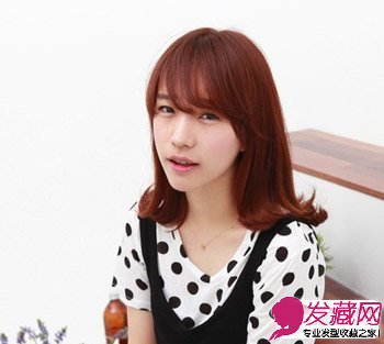 薄薄的刘海卷向一边恰好修饰了过宽的额头,丝滑柔顺的中长发自然披肩,发梢烫卷外扩,非常有造型感,红棕色的染发衬托的小脸格外白皙。