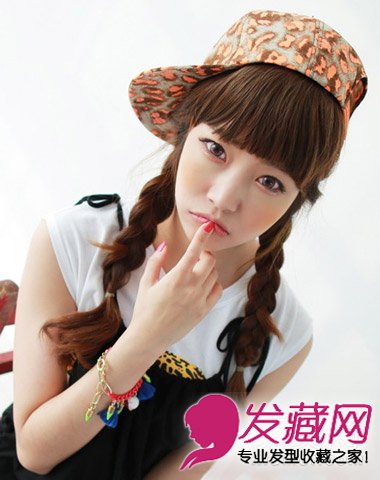 带点朋克风范的一款造型,齐整的长刘海遮住额头,长脸型变得娇俏起来,田园风的麻花辫减龄可爱,歪戴棒球帽,生气的小模样,更显个性帅气。