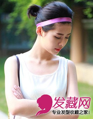 而对于头发不太长的女生来说,你同样可以做一个发髻出来,如图,简单用皮筋挽上戴上发箍来应对前额的碎发,更多了一抹清新亮点!