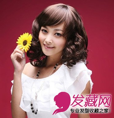 甜美可爱的小波浪发型,深棕色的染发高贵优雅,厚厚的刘海很好的修饰脸颊制造小脸,时尚俏丽。