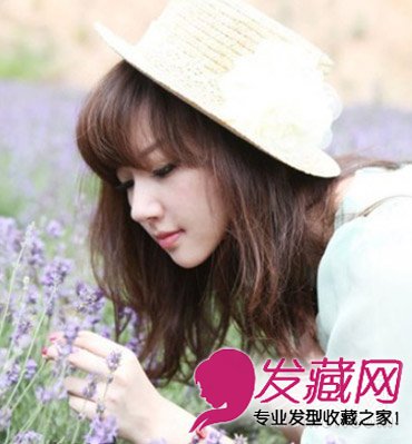 散乱蓬松的凌乱卷中短发,创造轻盈动感的青春少女味道,厚刘海如果蘑菇头一般将前面全部盖住,戴上白色的帽子,时尚靓丽。