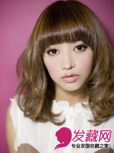 微微抬起的齐头帘,弯向内,其他从下巴处就开始弯曲,加上发色是栗色的,让整体感觉非常和谐。微微卷起的长发营造出空气感的蓬松效果,与齐刘海形成洋娃娃般的俏皮可爱效果,十分动人。
