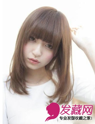 这也是比较常见的齐刘海发型,如果嫌头发不够垂坠,就干脆把发尾向内卷起,打造出长短不一的层次感。既能修饰脸型,又能卖萌装嫩。