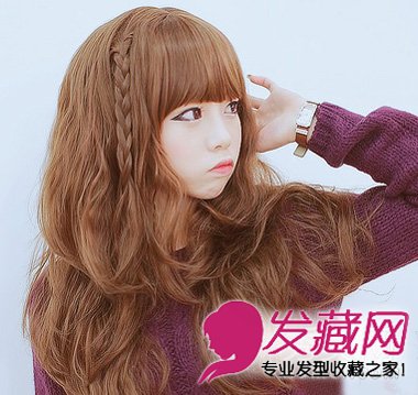 超卡哇伊的韩式洋娃娃卷,萌动的表情,瞬间秒杀,如此蓬蓬的发丝,编上麻花辫,长长的的遮额刘海,俏皮吸睛。
