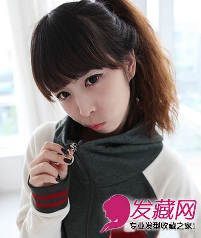 简单的高扎马尾辫发型,刘海紧贴着女生的脸颊,从视觉上缩小了女生的脸部面积,从而起到了很好的瘦脸功效,搭配可爱的齐刘海发型,一款充满着俏皮可爱气质的韩式发型,很适合修颜的方脸发型。