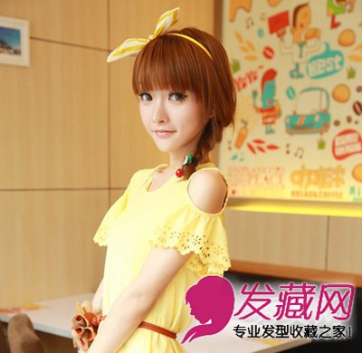 将女生的中长发编成一个三股辫吗,复古典雅的感觉展现出来,融入了时尚靓丽的橘色染发,将发型衬得潮流时尚,齐刘海的发型设计,遮住了女生的额头,修饰了美眉的方脸脸型,发顶处一个可爱的小蝴蝶结发箍的点缀,尽添俏皮之气。