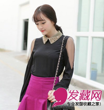 简单的低马尾扎发配上齐刘海也会显得不一样,这是OL们最爱的发型之一,微卷内扣的刘海有效小脸显瘦,更显女生文静气质。