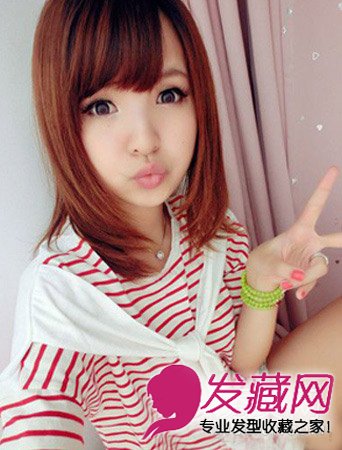 齐刘海微微向右撇,内扣的发型修颜效果很不错,配上棕色的染发,甜美气息满点。