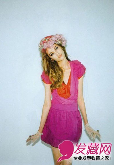 将所有发丝进行波浪卷烫,并且利用花环作为装饰,很巧妙的掩盖了额头过高的这一缺点,凸显出超强的田园风。