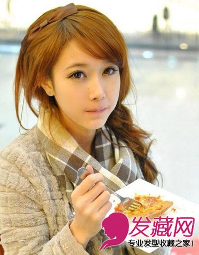松散的侧马尾扎发发型,清爽不失气质慵懒美,短斜分的刘海设计后,修饰小脸型更显完美,精美的发箍点缀,2014十足的可爱萝莉范!