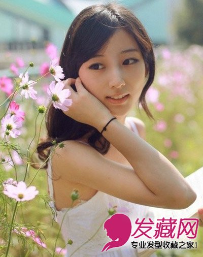 2015年时尚的小清新风格女生发型,卷发的中长头发,简单的斜分刘海,看起来时尚超有范,白色连衣裙的装扮,淑女气息更逼近了。