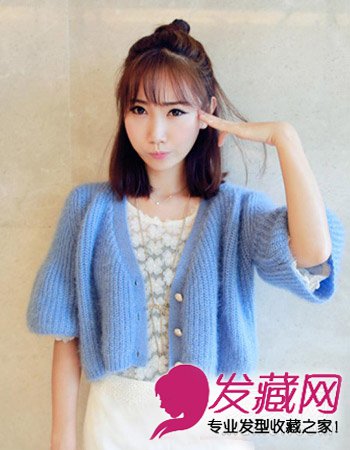 很显甜美范的一款中短发发型,只是经过微微的深栗色染发处理就足以凸显女生的清新感,空气感刘海与头顶一个半扎式的丸子头造型更显女生的调皮感。