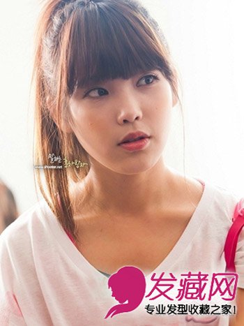 校园MM最爱的一款简单齐刘海扎发,长发扎马尾辫,修剪出圆润弧度的刘海发丝搭配内扣的长鬓发,轻松修出甜美脸蛋。