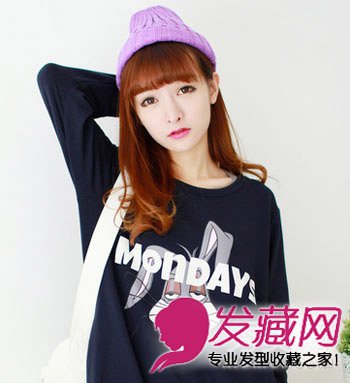 很显女生温柔清新感的一款齐刘海中长发发型,依然是亮丽温暖的橘棕色染发,这种发色在这个秋季可是最受欢迎的了,而整齐的刘海造型打造出女生无辜的萌态感,发梢微卷更显一丝活力。