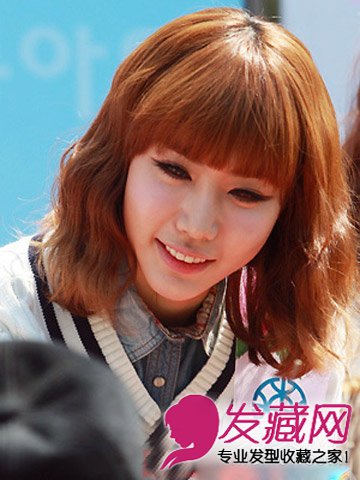 齐刘海中短卷发发型,栗色染发的短卷发在光照下很有莹亮质感,蓬松的烫发加上修剪整齐的齐刘海,甜美显嫩。