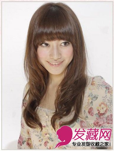 发型点评:长长的内扣刘海遮盖住整个额头,在刘海与发束衔接处将刘海剪裁出略长的效果,搭配长卷发效果更显唯美。