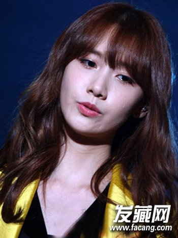 大脸女生最佳的一款修颜发型,深棕色的染发颜色让空气感十足的齐刘海卷发更添莹亮质感,空气刘海扮嫩修颜。