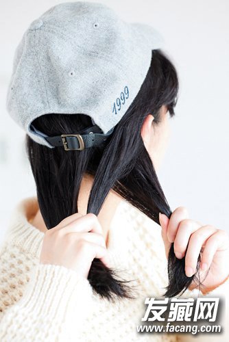 1,戴上帽子,在右侧把头发分为2股,右边那股再分成2股。把右边的发束和左边的发束梳到一起。