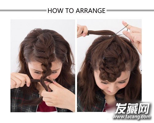 step 4:将辫子向内围绕成发髻,用发卡固定。周边在取少量头发半扎,遮盖辫子的发线,让刘海编发更加完美。