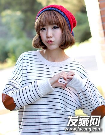 说到平刘海发型怎么能少了这样一款简单的波波头呢?最常见的波波头发型当然是这种有着厚重齐刘海的造型了,而与时尚的棕色发色相搭还有微微内扣式的发梢造型更是修颜减龄必备的一款造型。