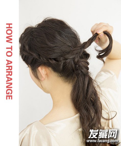 step2:将刘海沿着脸部轮廓编成蓬松的发辫后拉扯到脑后。