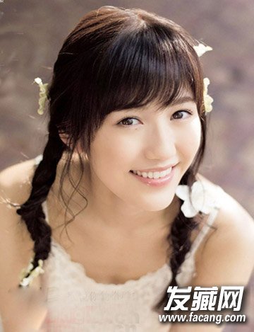 对于肉肉脸女孩子,精致的五官更显温柔水灵,用斜分的薄碎刘海遮住了小额头,搭配两个精致的麻花辫,打造出时尚的田园少女。