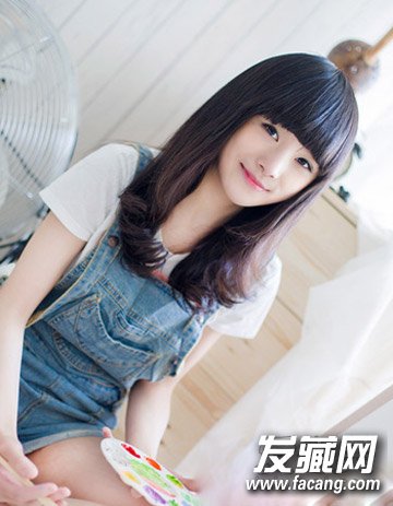 这一款简单的中长卷发显露出无疑的清纯气质来, 厚重的平刘海加上发尾的外卷清新甜美,无比动人。