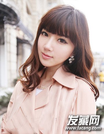 这是一款很甜美的齐刘海披肩卷发发型,棕色的发色衬托出白皙娇嫩的肤色,遮眉齐刘海下巴掌大的瓜子脸格外的精致迷人。
