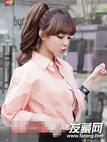 齐刘海搭配利落的马尾,是长脸MM的最爱发型之一,齐刘海正好遮住了额头,缩小了脸部的比例,马尾辫清爽利落。