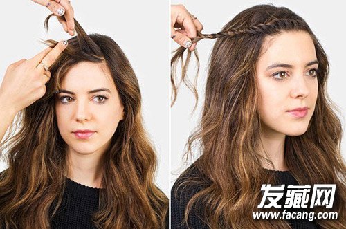 这款编发不仅要用到额头前方的短刘海,还要结合刘海两侧的中长发,从而让辫子比较长,最后用发夹固定,再用发饰遮盖发夹即可。
