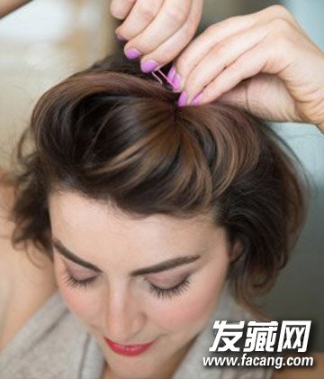 把刘海往后梳,用手捏住这股头发的末端,然后向前推,制造蓬松的感觉,然后用两个小发夹X型地固定好,最后喷一点定型。有染发的话效果会比较好,显得更有层次感。