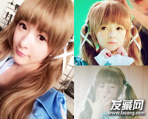 金棕色扎成日系双马尾,厚重齐刘海让脸型显得更加小巧精致,一双大眼清纯可人。