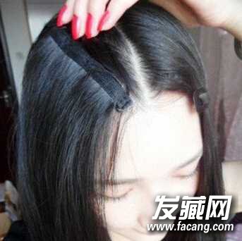 步骤8、将假发片放在侧分发际线处,注意要调整好假发片的位置,让上面的头发可以完全遮住假发片的上方,再用手稍微整理一下;